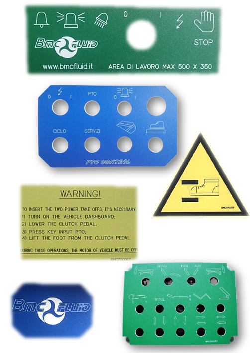 Le targhe incise a pantografo (area di lavoro 350 x 500 mm.) possono essere realizzate in materiale: alluminio anodizzato argento, alluminio anodizzato nero spessore 2 mm. & plastica colorata spessore 1.6 mm.  con loghi personalizzati e caratteri standard.
